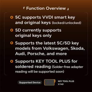 Currently, Only VVDI Key Tool Plus Full Version and VA Version support key adding and reading functions on VW 5C 5D. More Xhorse tools will be supported in the future. Update your Key Tool Plus to V143 to unlock this new feature.
